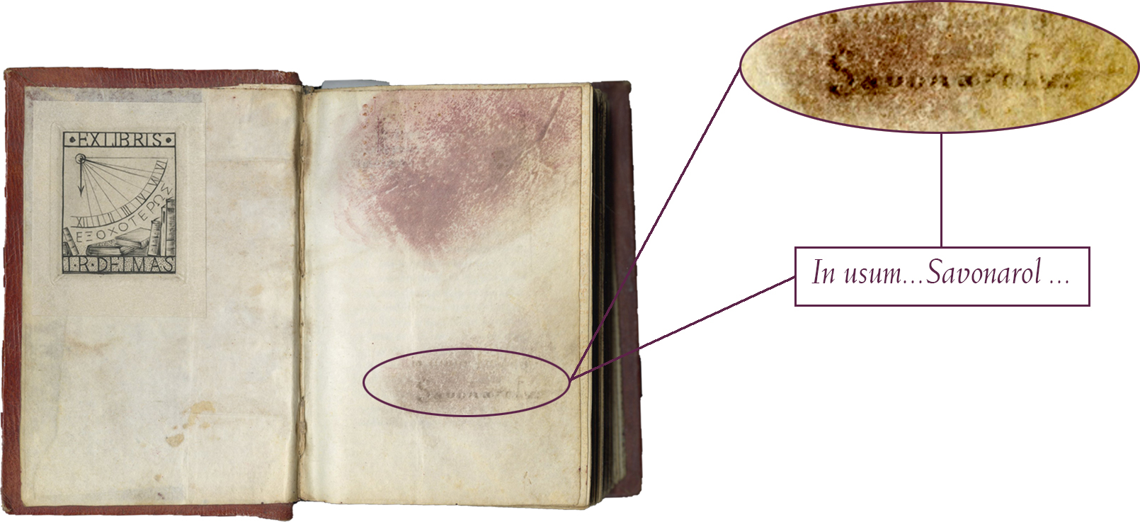 Les Enluminures, TM 1323, detail of a note on the front flyleaf that can be read, “In usum...Savonarol ...”