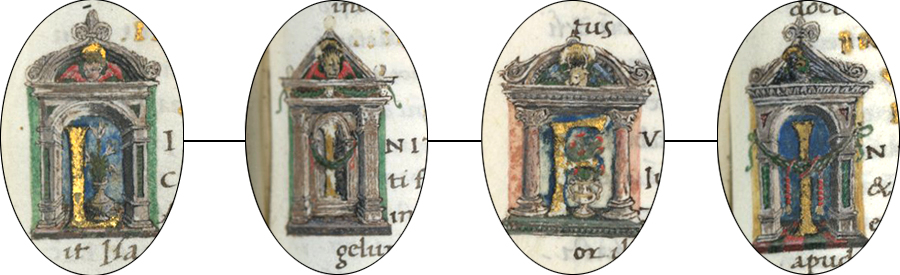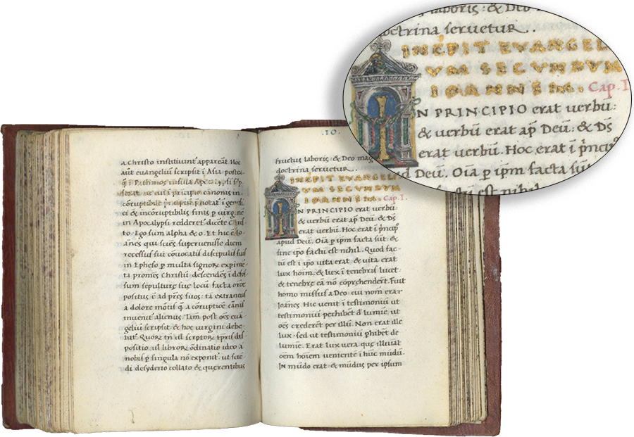 The symbols of the Evangelists were used in manuscripts of the Gospels since the early Middle Ages. But the style of these exquisite little initials that combine a classical motif with references to the Gospels is very unusual; we know of no parallel.