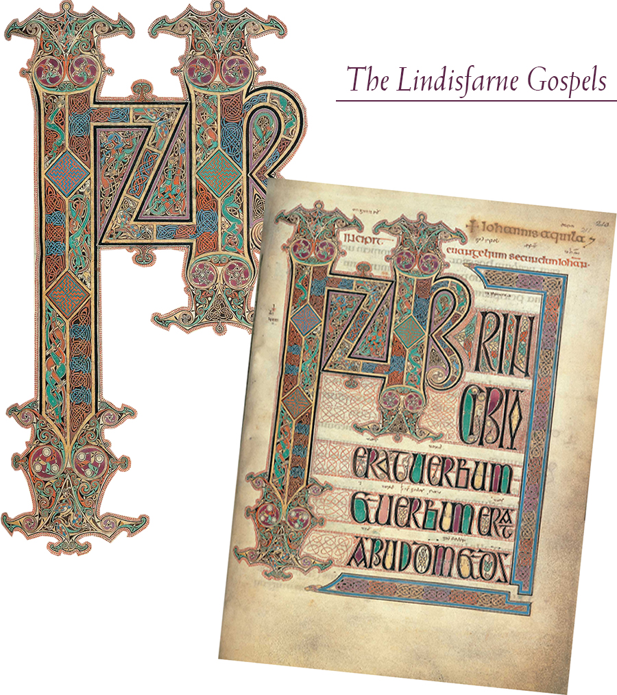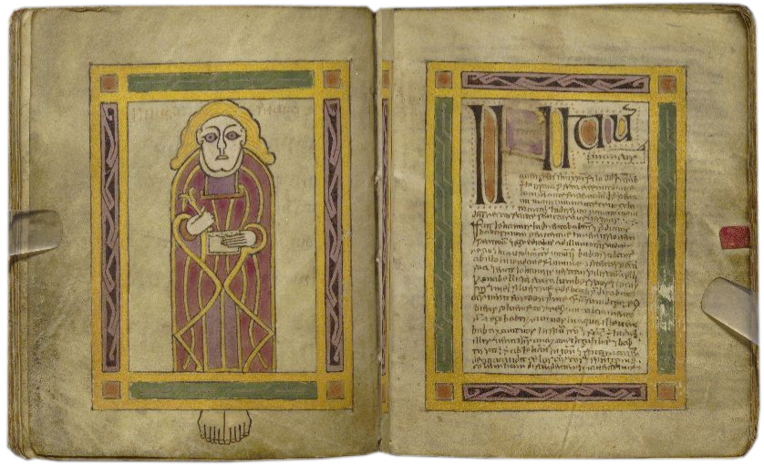 Some of the most famous medieval manuscripts are Gospel Books (that is, manuscripts with the complete text of the four Gospels, Matthew, Mark, Luke, and John, accompanied by introductory texts including prologues, and, often, the Eusebian Canon Tables). Chances are that even someone who never thinks about the Middle Ages will have heard of two of the great monuments of Insular art, the Lindisfarne Gospels and the Book of Kells: the Lindisfarne Gospels (which has been called the “most spectacular manuscript to survive from Anglo-Saxon England”) was made c. 700 on Holy Island, or Lindisfarne, off the northeast coast of England;