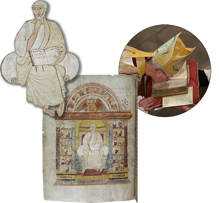 On the right: Archbishop Justin Welby kissing the Gospels of St. Augustine (BBC news, 2013)