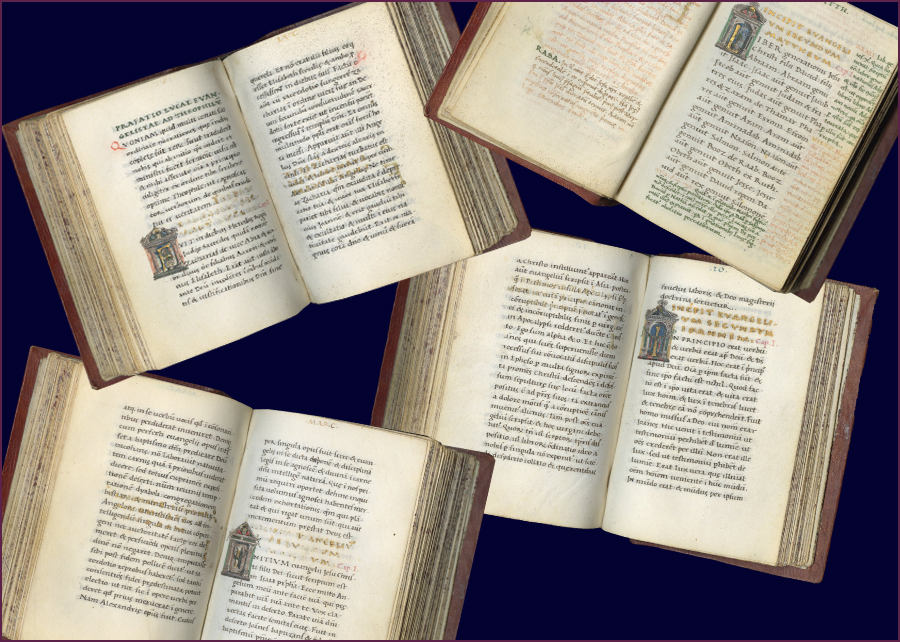 To this point, our discussion has emphasized the sacred functions of the Gospel Book in the Middle Ages. But our tiny humanist manuscript points to another type of Gospel manuscript, namely manuscripts copied for study, like manuscripts of the Gospels accompanied by the Glossa ordinaria, or Ordinary Gloss, which presented the sacred text accompanied by commentaries together on the same page.