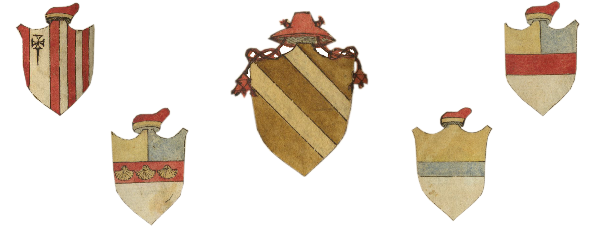 And there’s more. The doge’s crown was not the only kind of headgear that a Venetian might be honored to set atop his arms. When a member of one of these families was appointed to high ecclesiastical position, specifically cardinal or pope, the appropriate headgear has also been included.