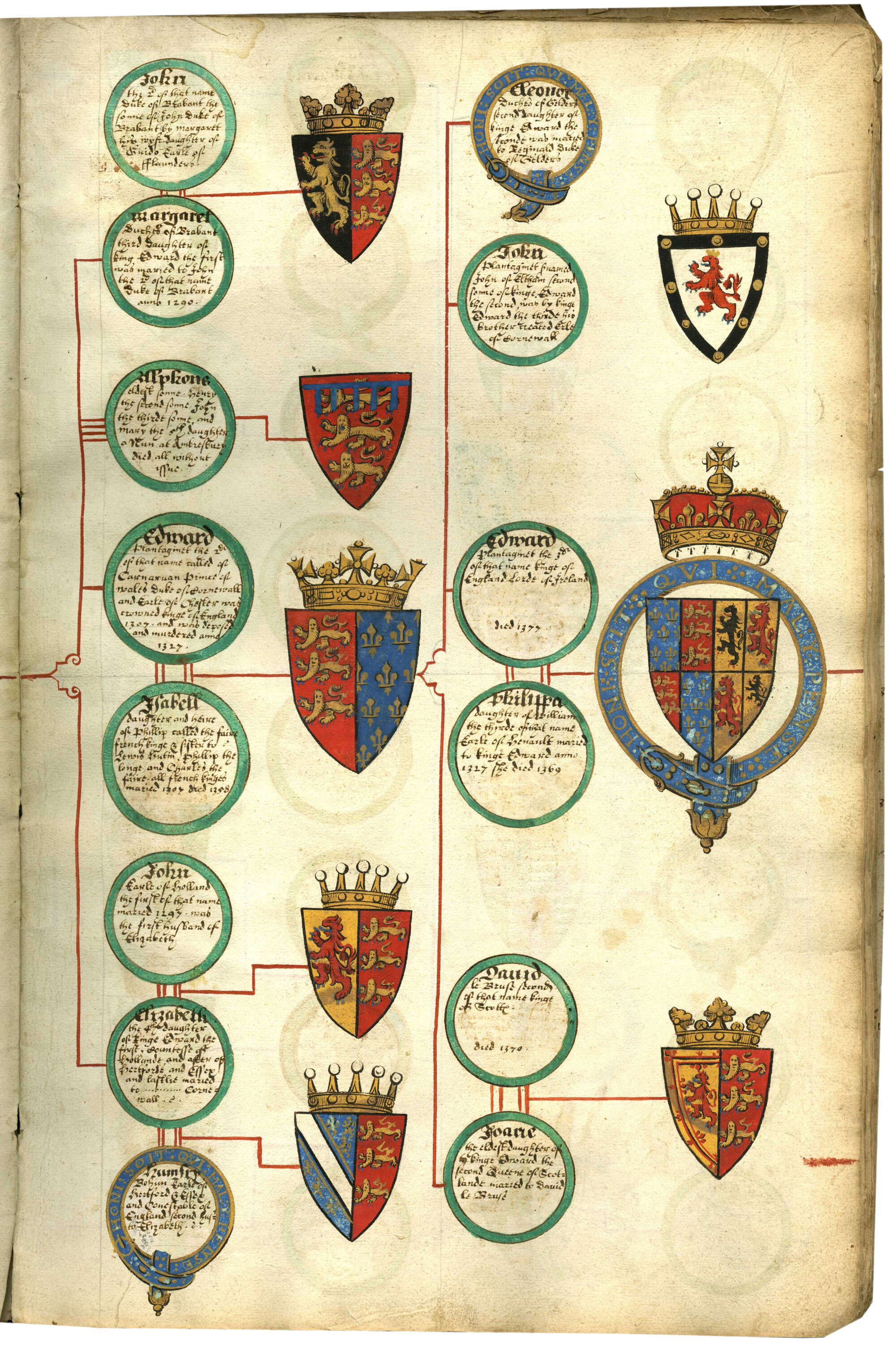 The combined arms of Edward II and his wife, Isabella of France; the arms of Edward’s elder brother Alphonso, who died young; the arms of Edward’s sister Elizabeth and her first husband, John I, Count of Holland; the arms of Edward III and his wife, Philippa of Hainault; and the arms of David II and his wife, Joan of the Tower, sister of Edward III, all featured in this genealogy of the kings and queens of England, TM 627, f. 5, England, after 1558 and prior to 1603, c. 1590-1600