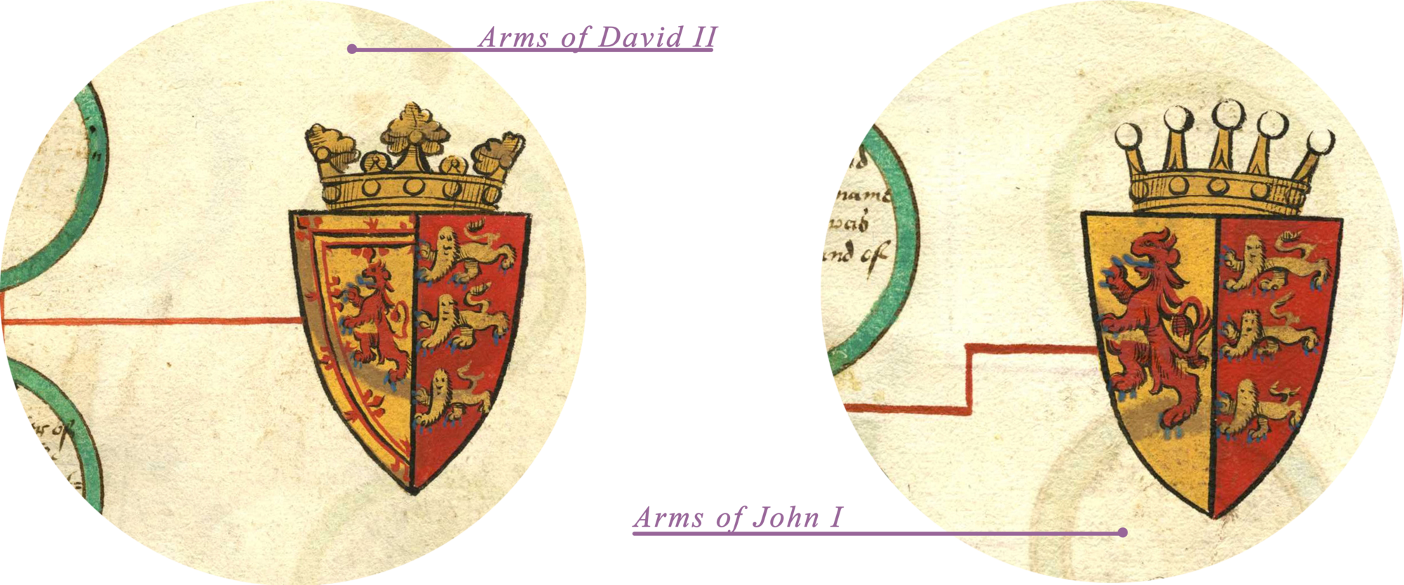 The two remaining types of crown are coronets denoting the ranks of duke and count. In one instance the ducal coronet surmounts the combined arms of David II, king of Scotland, and his English wife – perhaps a slight on Scotland, which England had attempted to annex in both the fourteenth and sixteenth centuries. The other coronet more predictably accompanies the combined arms of John I, Count of Holland, and his English wife.