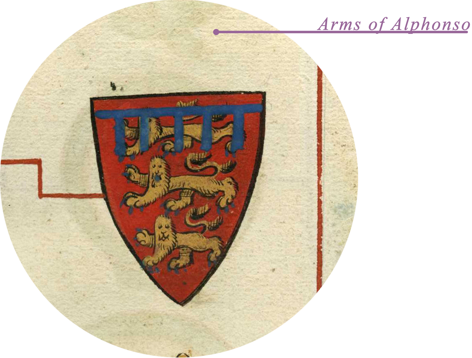 And what of the arms with no crown whatsoever? These belong to Alphonso, heir to the throne of England, who died at the age of twelve and was therefore never crowned. His younger brother, Edward, subsequently bore these arms (specific to the heir apparent) and later became the ill-fated Edward II.
