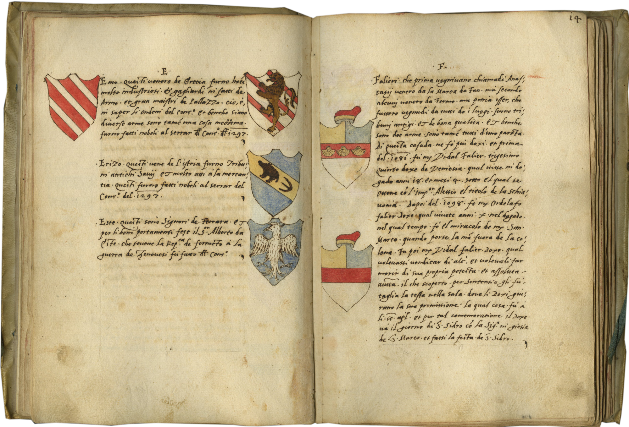 Venice was a republic at the time and subject to neither king nor emperor. Instead, the Republic of Venice was governed by a doge, who was elected for life; an aristocratic senate; and a number of councils, most notably the Great Council, whose members were drawn from the very families identified in this manuscript. Even at a glance, this manuscript attests to the fact that a number of doges were appointed from these families too. The unusual hat atop so many of the Venetian arms actually represents part of the doge’s regalia and is known as the corno ducale, the doge’s crown.