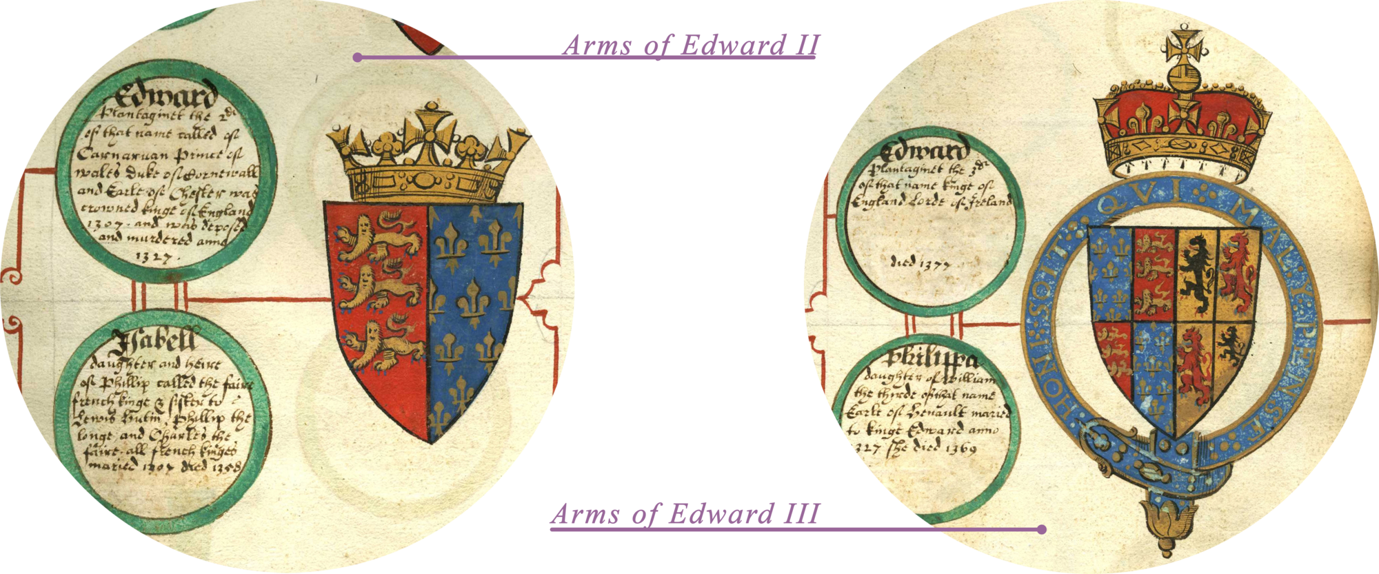 Consider this Tudor roll of arms. It contains a genealogy of the English royal family, which explains the abundance of crowns and coronets surmounting these coats of arms. But why so many different kinds of crown? The two largest crowns in the center of the page surmount the combined arms of fourteenth-century kings of England Edward II and Edward III and of their queens’ families.