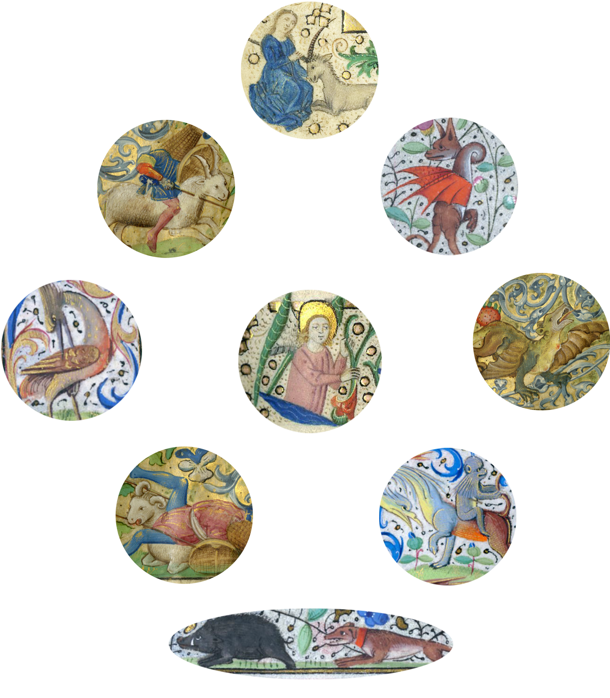 These creatures inhabit the margins of three Books of Hours, BOH 136, ff. 45, 47 (details), Northern France (Rouen), c. 1490-1510; BOH 102, ff. 16, 31, 87 (details), France (Paris), c. 1490; and BOH 94, ff. 1v, 44 (details), Eastern Netherlands (probably Zwolle), c. 1470-1480