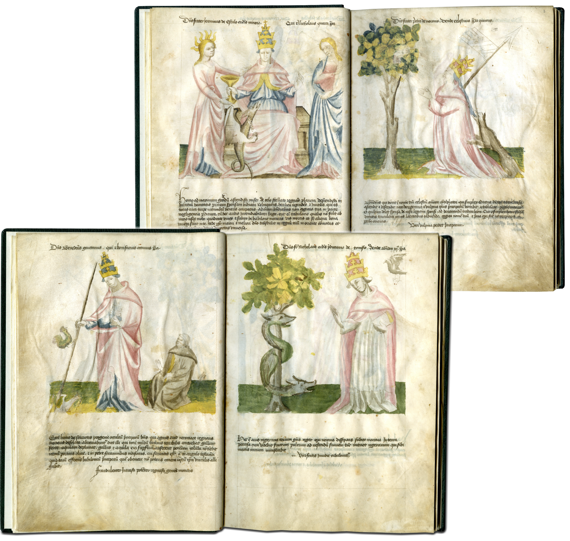 But they are far from marginal in this fascinating and phantasmagorical manuscript, which features a set of illustrated prophecies known as The Prophecies of the Popes. Here they occupy the center of the page and they hold far more meaning than meets the eye.