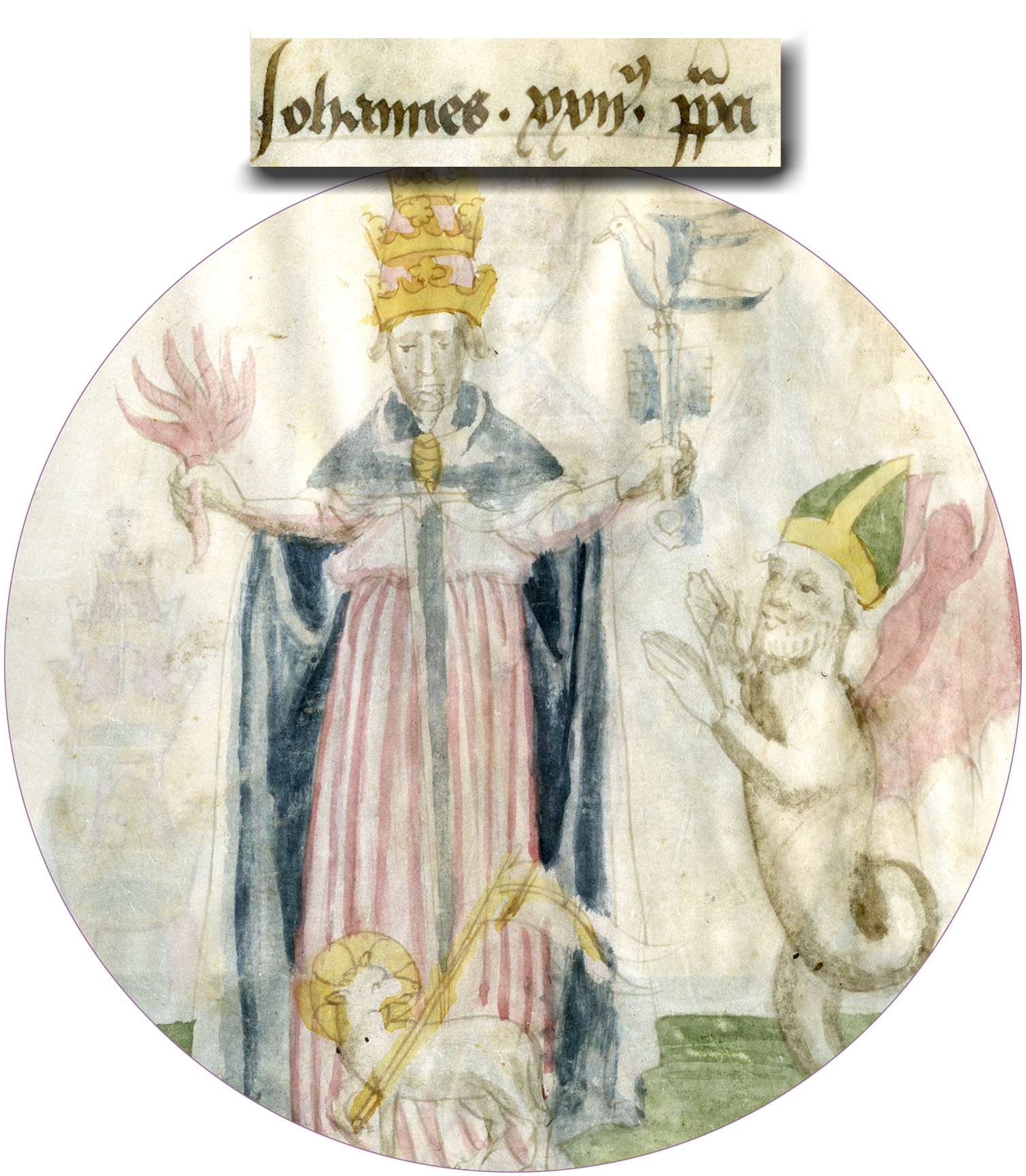 John XXII is shown here wielding a scourge in one hand and the keys of St. Peter, symbol of his papal office, in the other, with a demon wearing a bishop's mitre off to one side, Vaticinia, f. 5