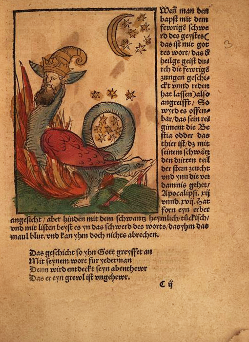 This woodcut of the Beast of the Apocalypse appeared in a 1527 papal tract by Andreas Osiander and Hans Sachs, Eyn wunderliche Weyssagung von dem Babstumb, Nuremberg, Hans Guldenmundt