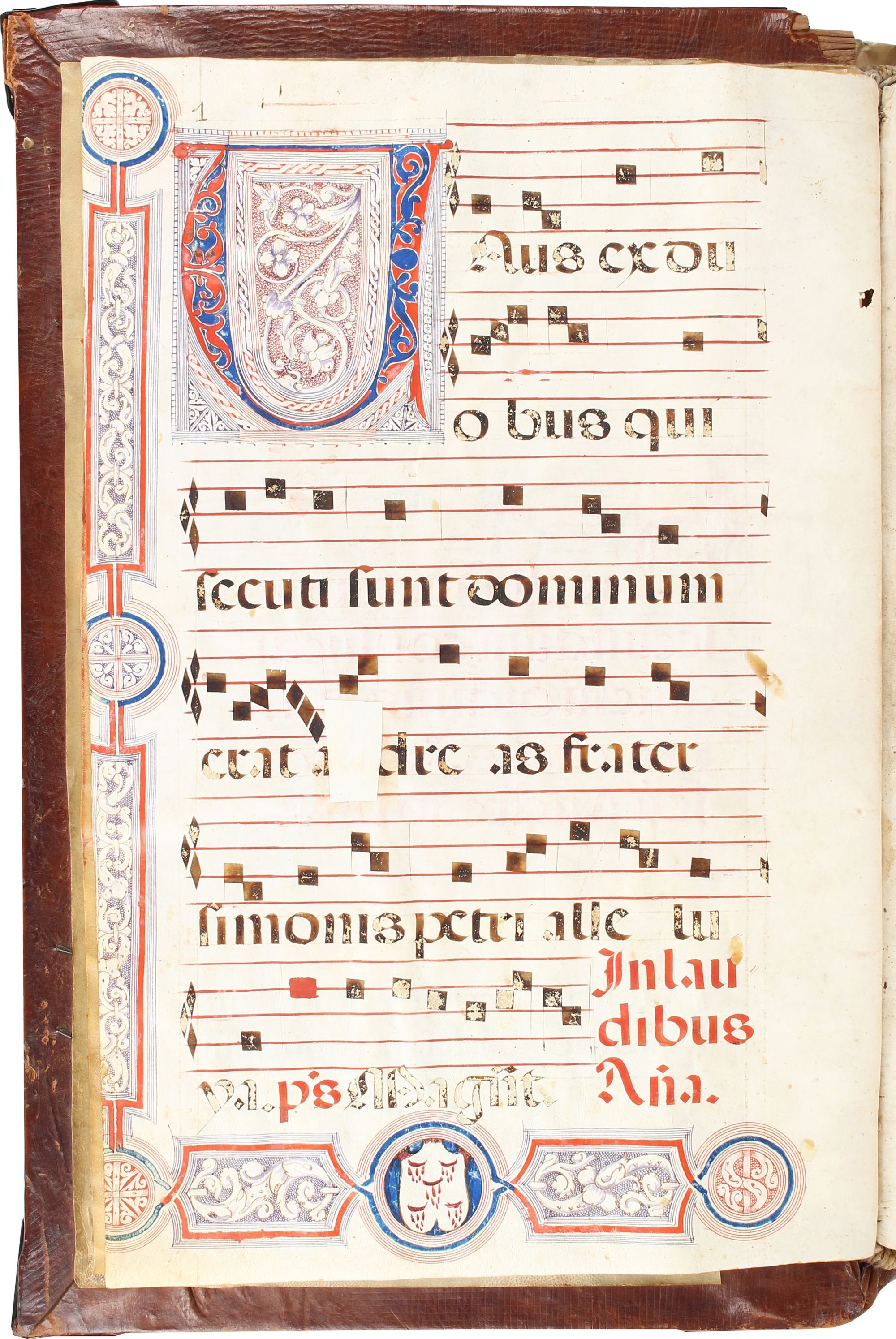 Antiphonals were volumes with the text and music sung by the choir during the Divine Office; Graduals included the sung texts, with the words, for the Mass. Many of these massive volumes now survive, sadly, only as single leaves or as cuttings. To really understand what these books were like and how they were used, you absolutely need to see a complete manuscript (or to sing from one; there is no substitute for that experience!).