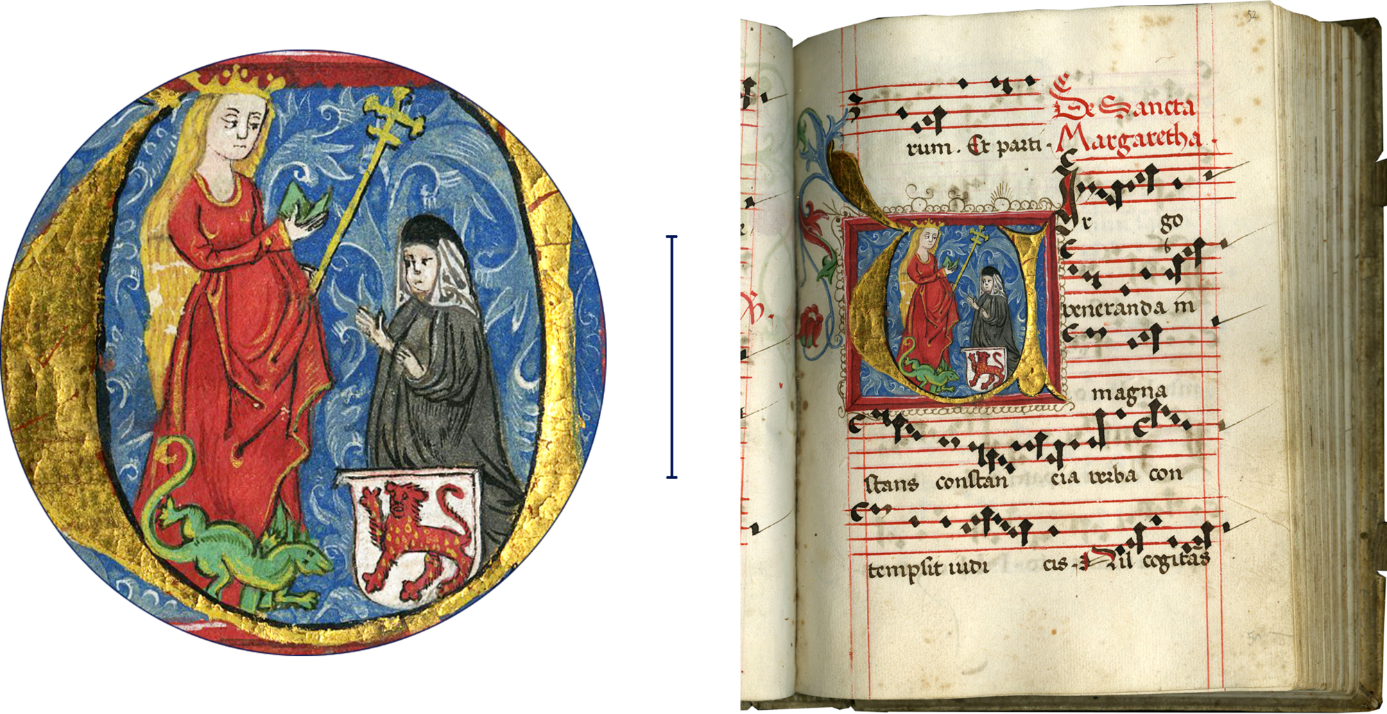 Margaret Marckdorff, the first owner, and possibly the scribe and illuminator of this Processional, with her family arms next to her, kneeling before St. Margaret. TM 990, Processional of Nonnberg Abbey, Austria (Salzburg), c. 1505-1515.
