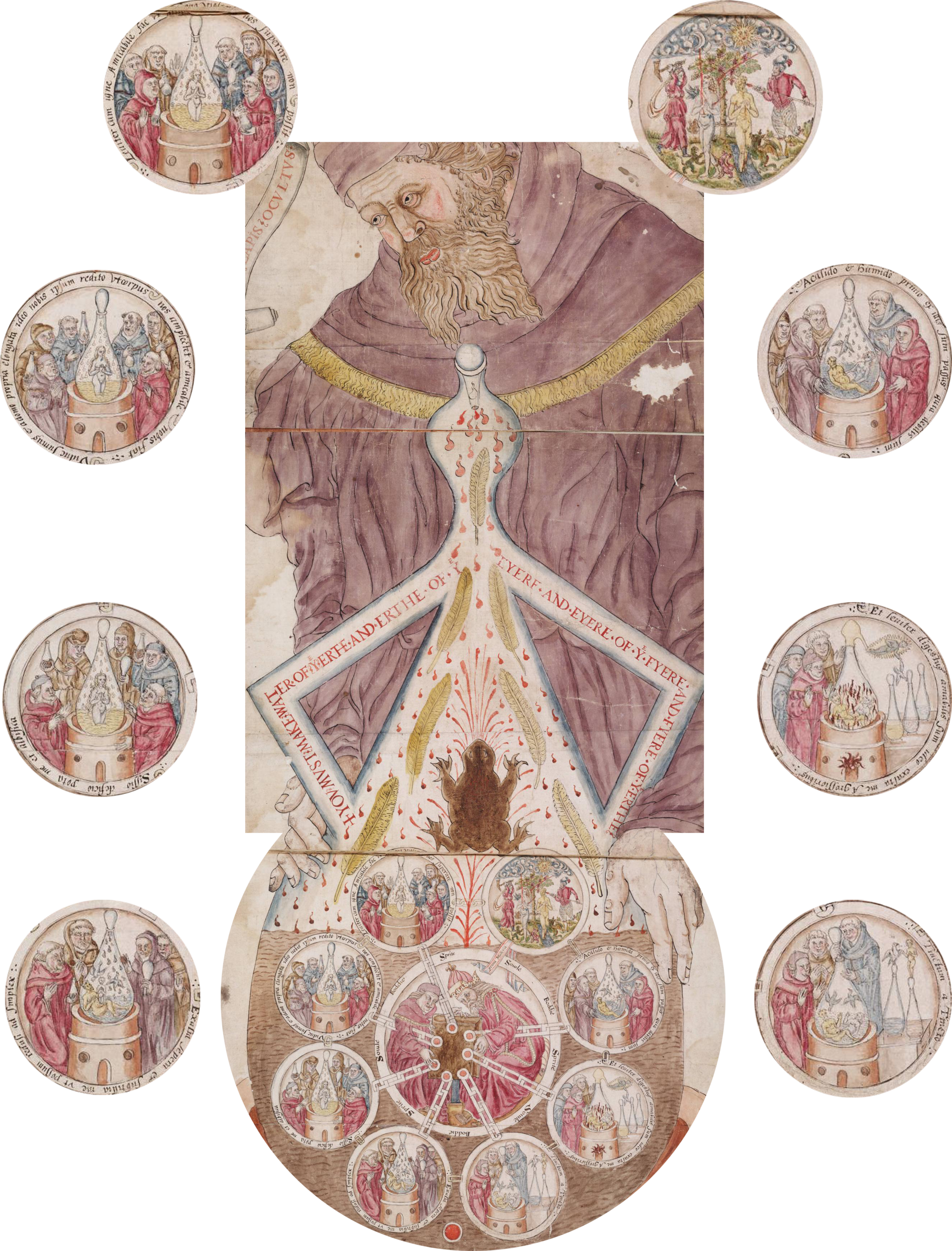 This symbolically dense alchemical scroll, one of the “Ripley” Scrolls, named for one of England’s most famous alchemists, employs esoteric alchemical emblems to represent the stages by which the philosphers’ stone was produced, New Haven, Beinecke Library, Mellon MS 41, England, c. 1570, details