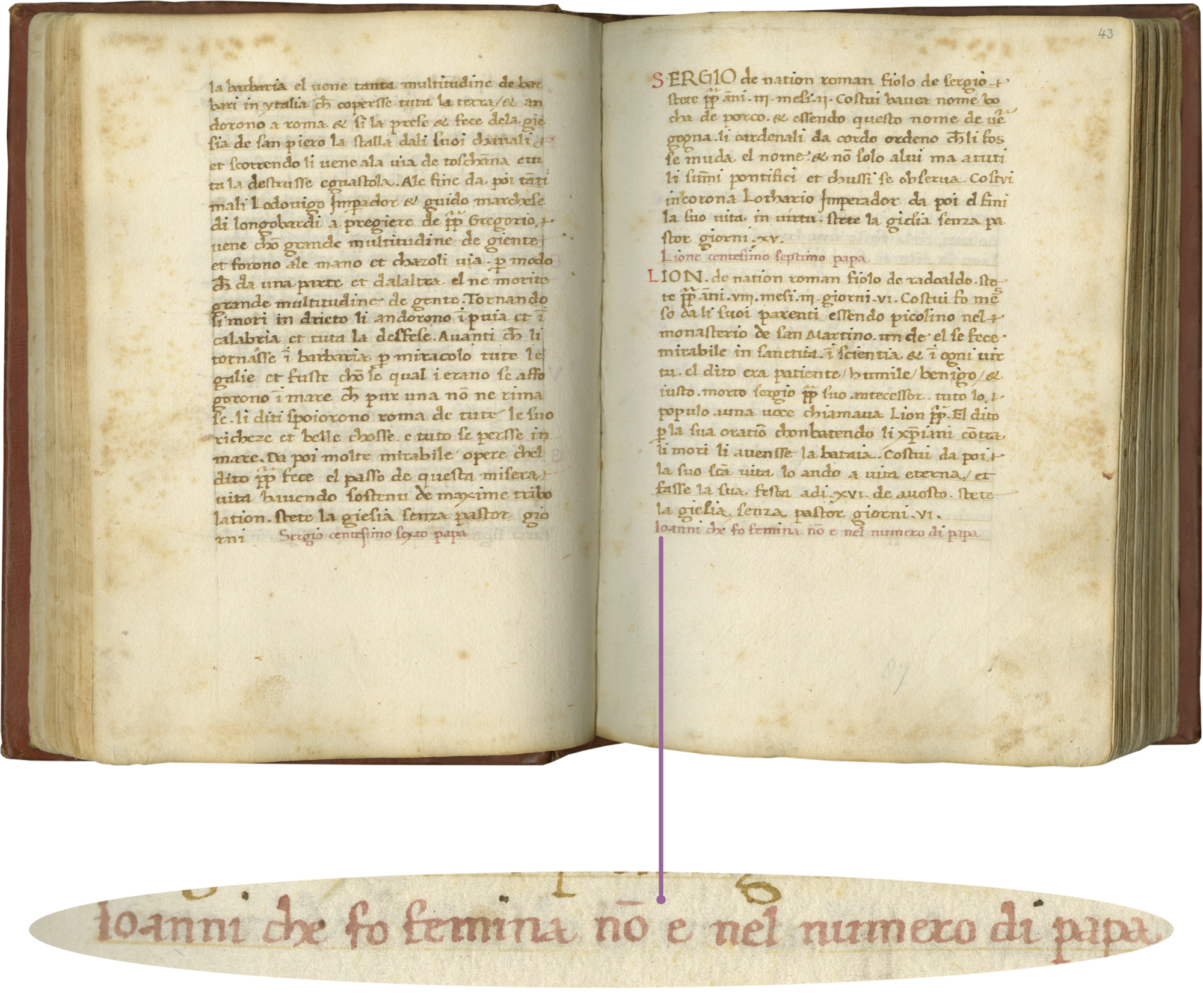 In any event, the inscription is correct. Among the many sensational events that this chronicle recounts is an account, almost certainly fictitious, of Pope Joan, a woman who supposedly disguised herself as a man and was elected pope in the ninth century. In fact, this chronicle’s Latin source, the Chronicon pontificum et imperatorum of Martinus Polonus, furnishes one of the earliest and most popular accounts of this legend.