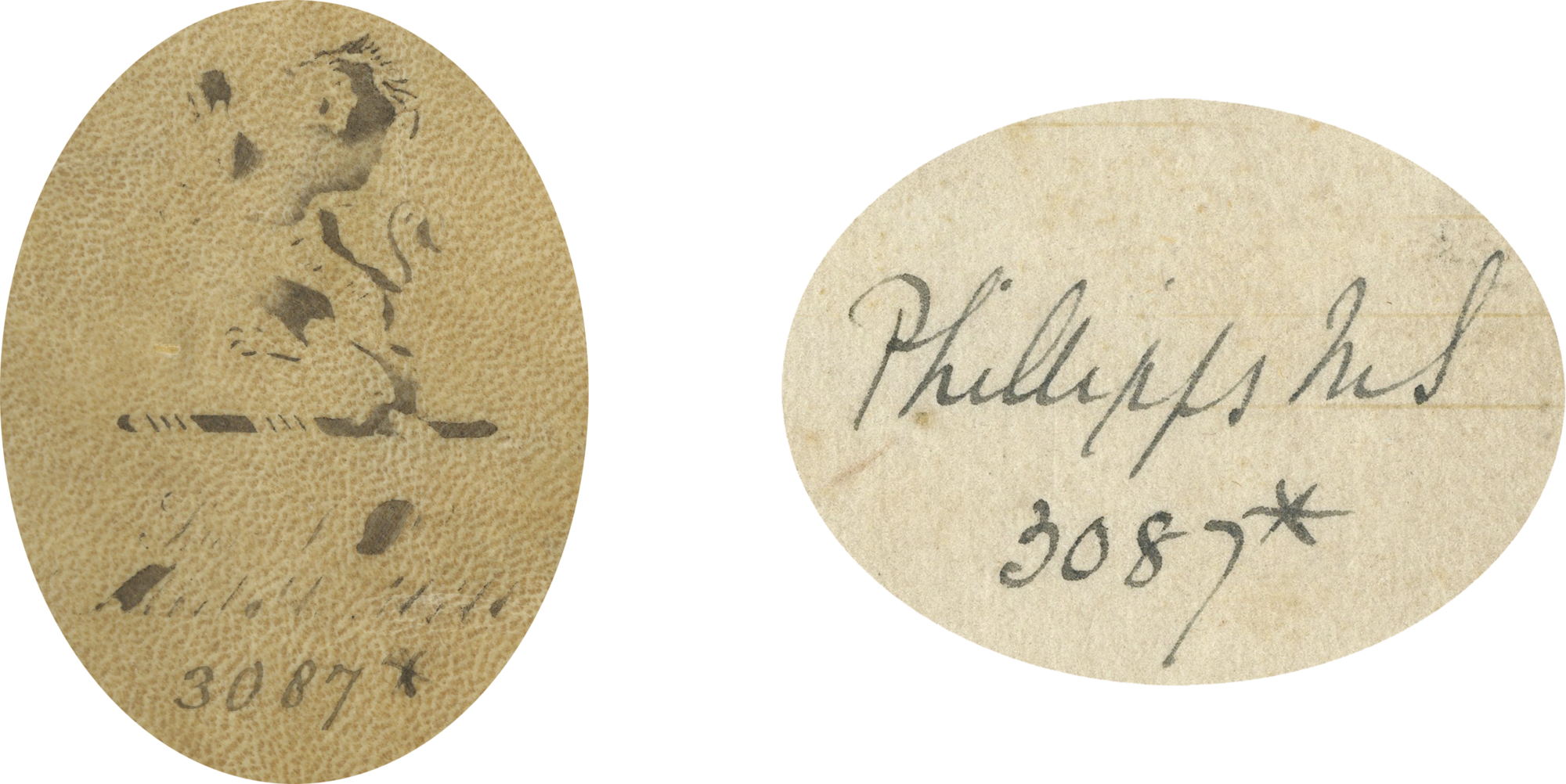 Accompanying the many marks of ownership at the opening of this manuscript, the inscription above not only dates to the long period in which Phillipps owned this manuscript, but also resembles specimens of his handwriting preserved in auction catalogues and correspondence. Phillipps himself may well have made this note in the front of the book.