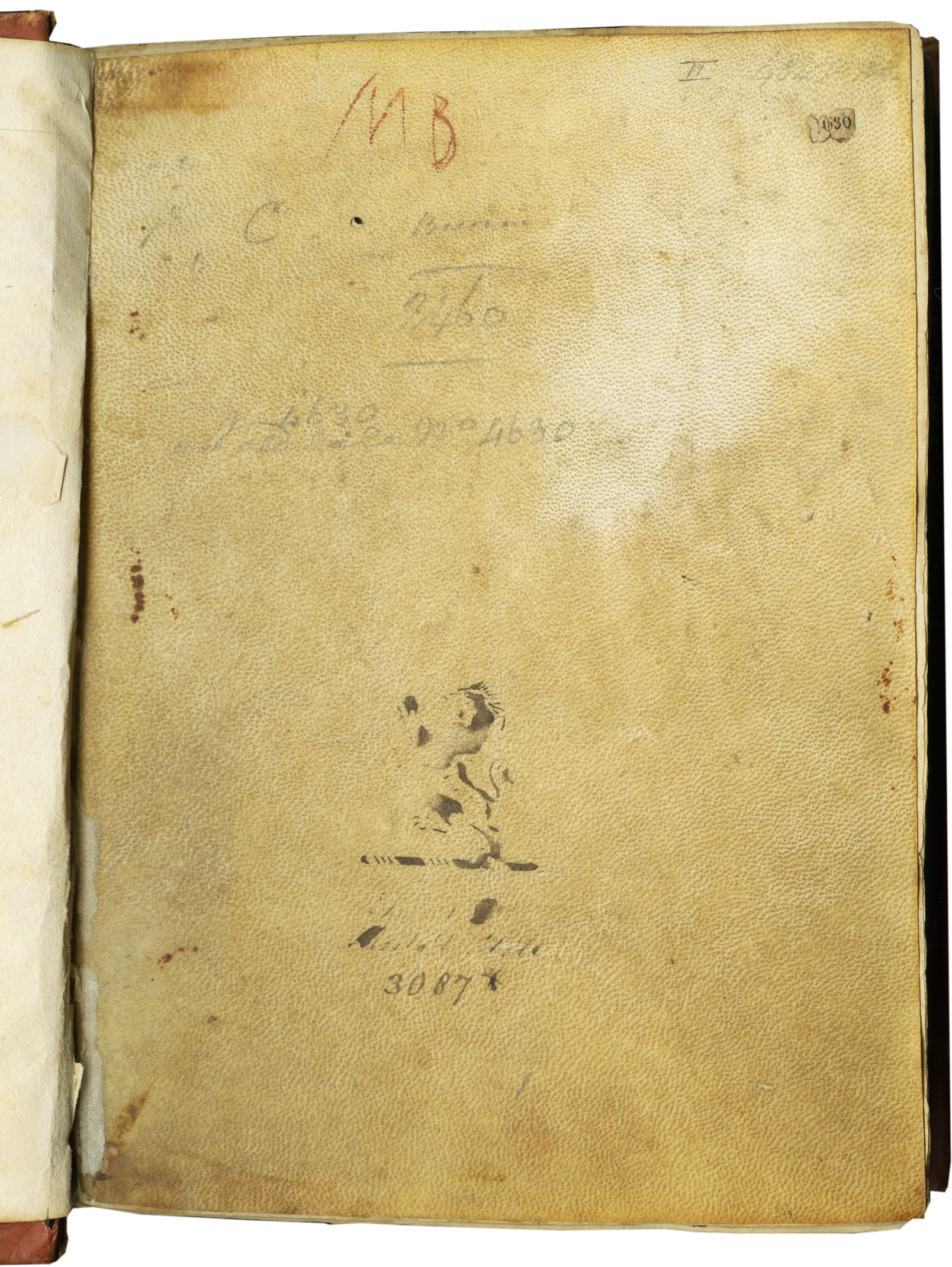 This stenciled crest appears in many of the manuscripts in the collection of Sir Thomas Phillipps, as does an accompanying inscription with the shelfmark Phillipps assigned to each of his manuscripts, TM 117, ff. ii recto (detail) and 1 (detail)