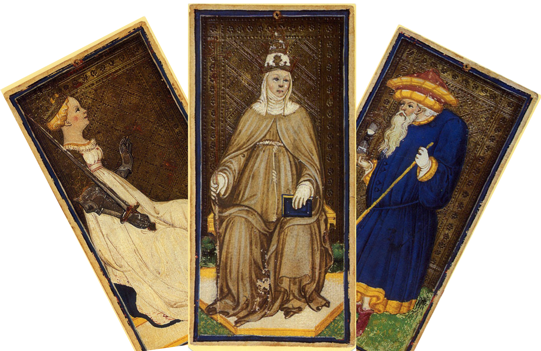 Possibly in reference to the legend of Pope Joan, the Popess featured in many early tarot decks, including the Visconti-Sforza tarot deck, drawn by Bonifacio Bembo, New York, Pierpont Morgan Library, inv. M. 630, c. 1450