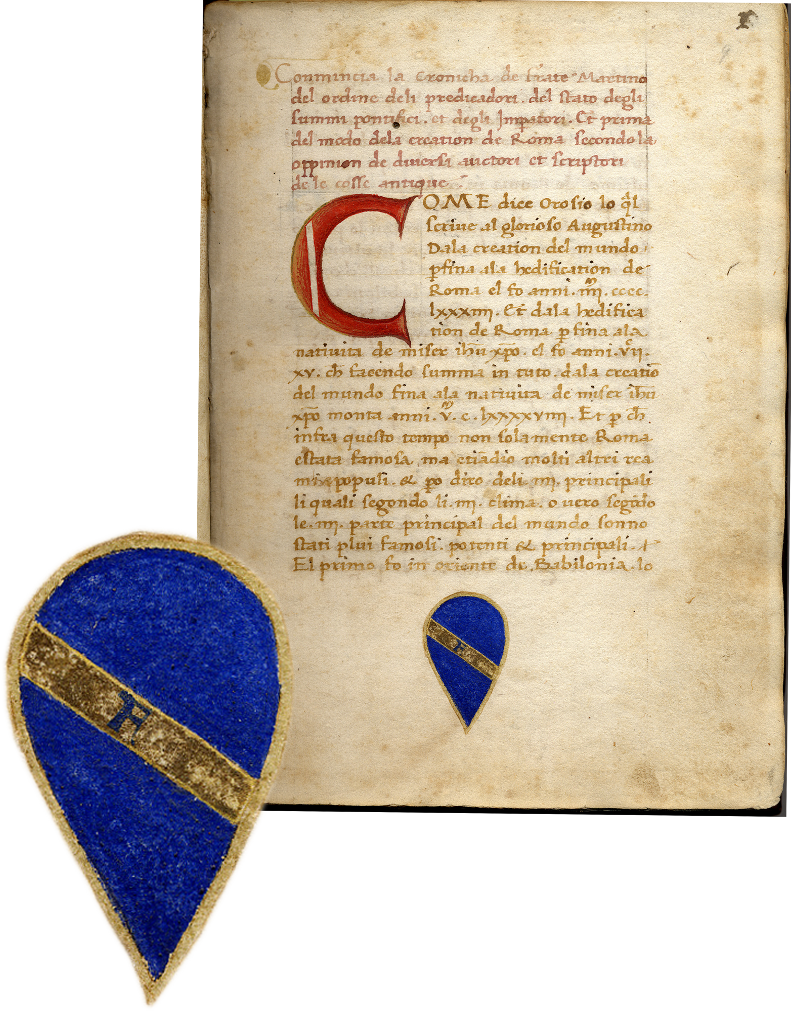 The opening page of the Cronica degli pontifici e degli imperatori features a trace of one of its earliest owners in the coat of arms painted in its lower margin, TM 117, f. 9