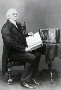 Photograph of Sir Thomas Phillipps, self-proclaimed “vello-maniac,” seated with two manuscripts from his enormous collection, 1860