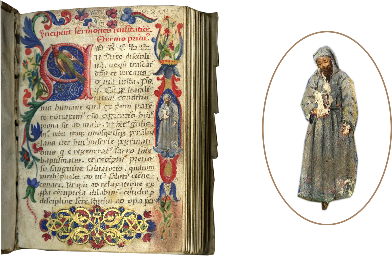 A second Carthusian manuscript from a yet unidentified charterhouse in Northeastern Italy begins with a lavish illuminated border featuring a monk (presumably a Carthusian monk, although the Carthusian white habit looks rather gray here). The text opens with a series of seven sermons to preach at visitations and other occasions (there is one for the election of the prior). These are specifically Carthusian sermons which mention their audience (often “venerable fathers and brothers,” that is the priors and monks present) and sometimes specific Carthusian statutes, on themes that are suitable for a penitential occasion like a visitation.