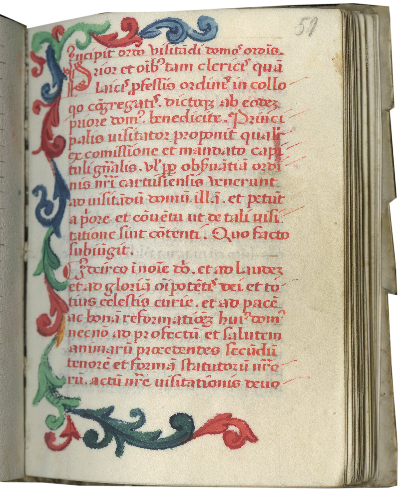 It concludes with the results of a visitation by the priors of the Carthusian charterhouses near Florence and Venice, settling a dispute between the Prior of the charterhouse of St. John the Evangelist at Calci near Pisa and one of his monks, dated June 22, 1534. The names are not included, but are represented by the letter “N.”