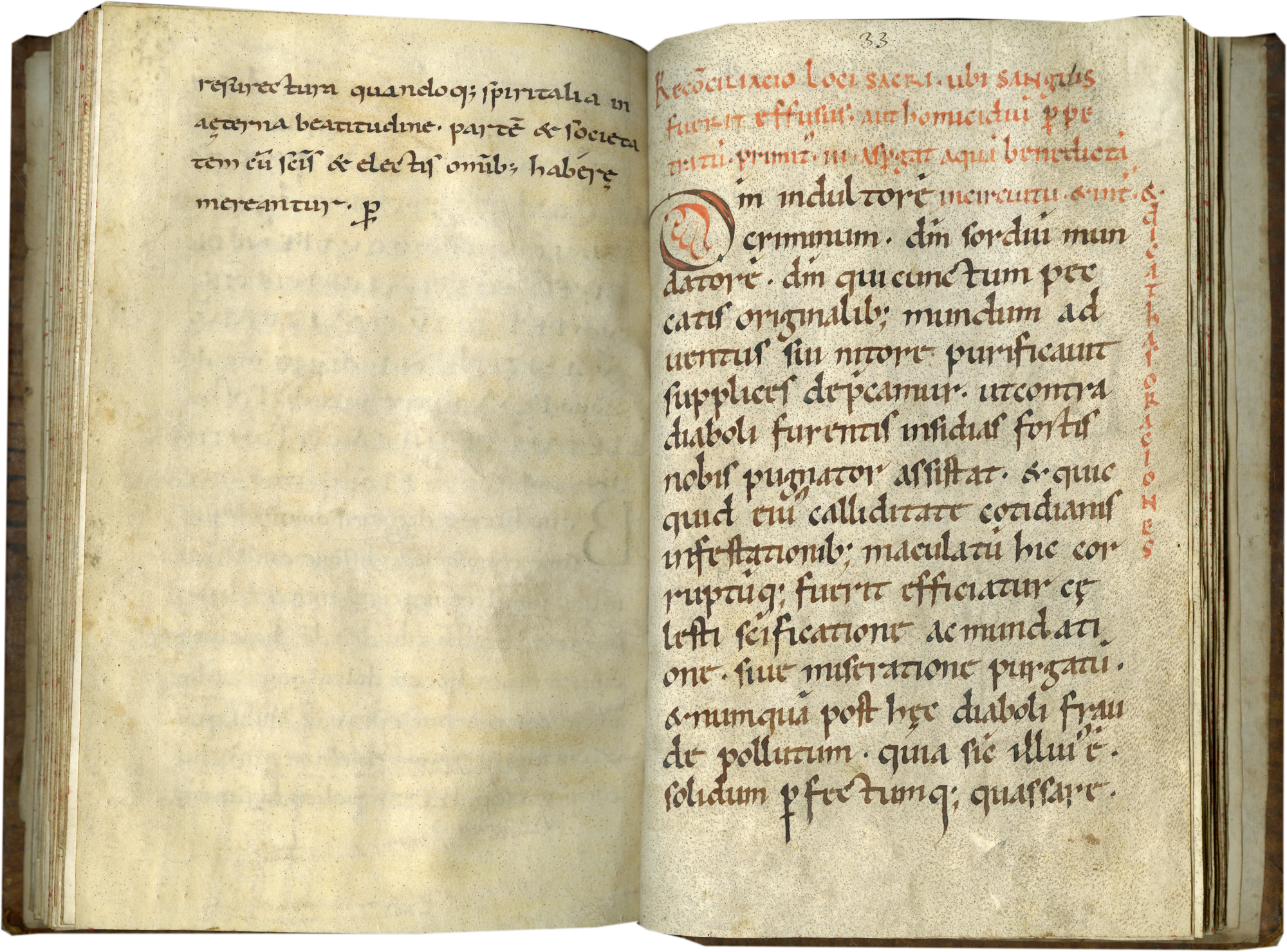 Another mystery is the ritual added in empty space on folio 32, written in slightly darker ink, giving the text for the blessing of a cemetery – an intriguing early witness to changing attitudes about places for the dead. In the late eleventh century cemeteries were increasingly seen as be inviolable spaces, offering protection to both the living and the dead. Anyone found guilty of a crime on cemetery ground would face heavy fines or excommunication. The new importance of sacred cemeteries was popularized by Pope Urban II, who consecrated (or re-consecrated) cemeteries as he traveled through France in 1095. The practice, as described here, involved the bishop and his priests singing songs while walking in a circle around a cemetery and sprinkling holy water.