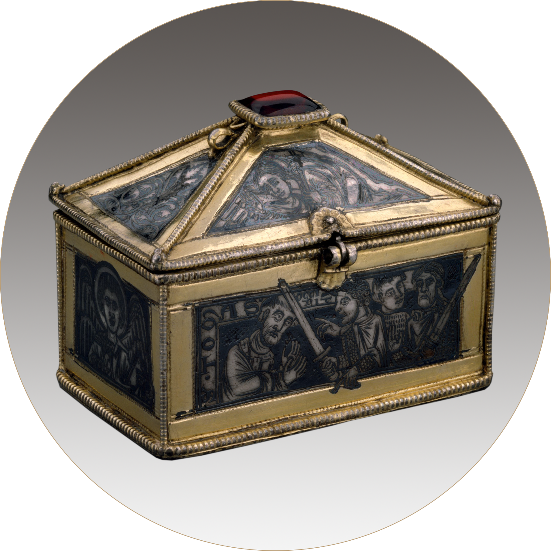 A red glass cabochon evokes the blood of the saint, set in the top of a Reliquary Casket with Scenes from the Martyrdom of Saint Thomas Becket, c. 1173-80, Metropolitan Museum of Art (17.190.520)