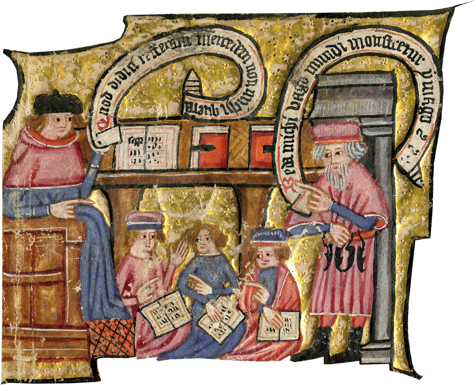 Historical and Cosmological Anthology, England, probably London, c. 1325, f. 120v. A School Scene, with three students seated on the floor, each with an open book, flanked by a seated figure in academic(?) garb holding a scroll.