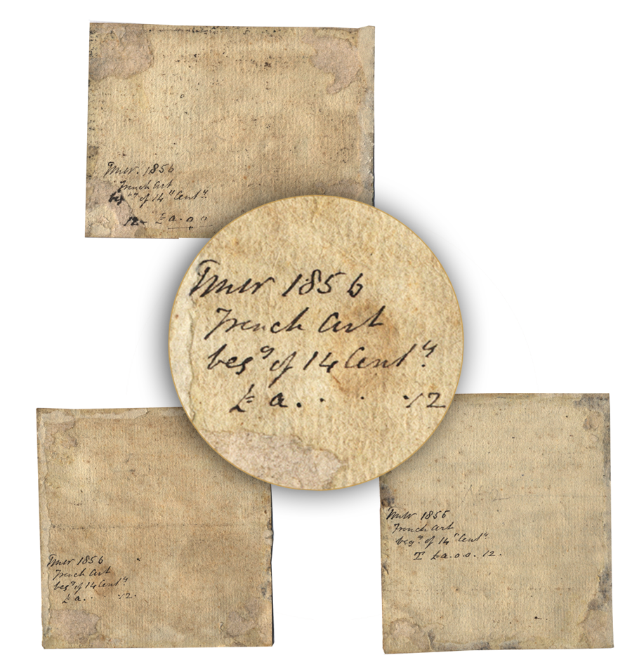 The reverses of all three miniatures are lined with paper, on which T. M. Whitehead wrote the date (“1856”) and his price code (“£a.o.o”) in ink.