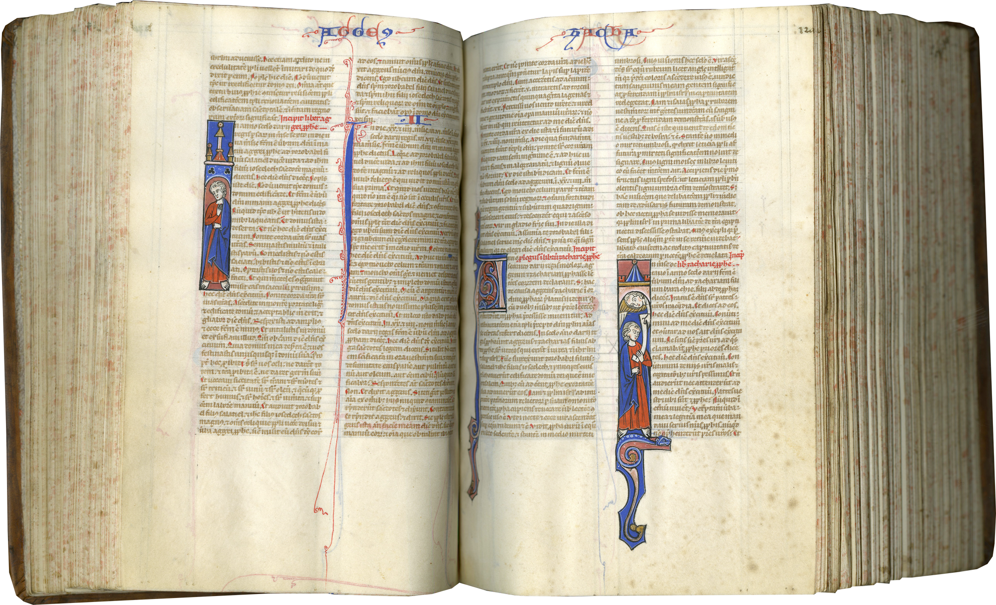 The illuminated Bible historiale was among the “must haves” of the 15th-century upper crust, but it and other translations of the Bible never entirely win out over copies of the Latin Bible known as the Vulgate, which was reformatted and repackaged generation after generation. Among these is the 13th-century Paris “pocket” Bible, like our TM 921.