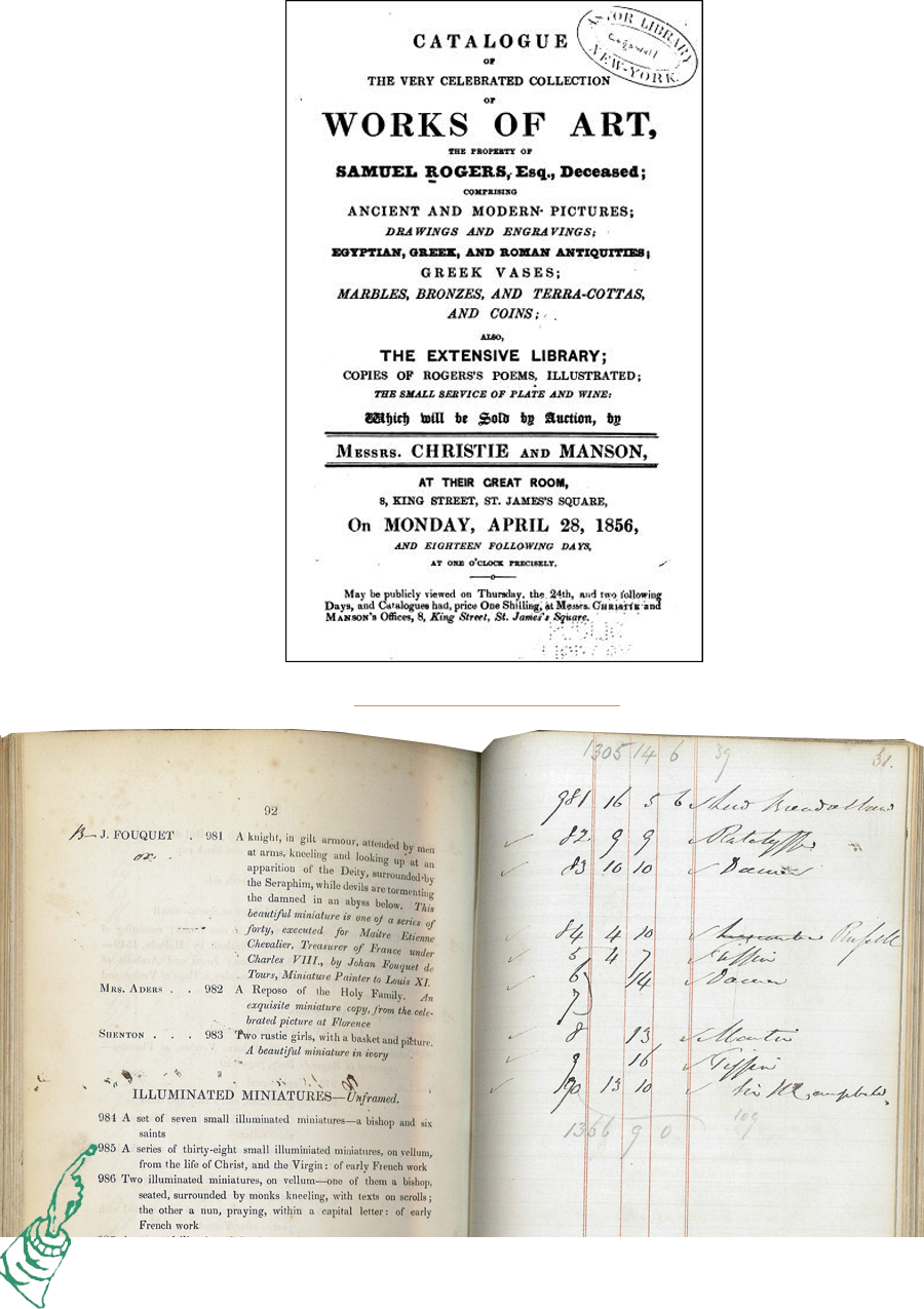 Title page of the 1856 catalogue of the Samuel Rogers sale (left, image courtesy of Peter Kidd), with our three miniatures part of lot 985, recorded as sold to Tiffin in the Auctioneer’s Book (right, image courtesy of Christie’s Archives)