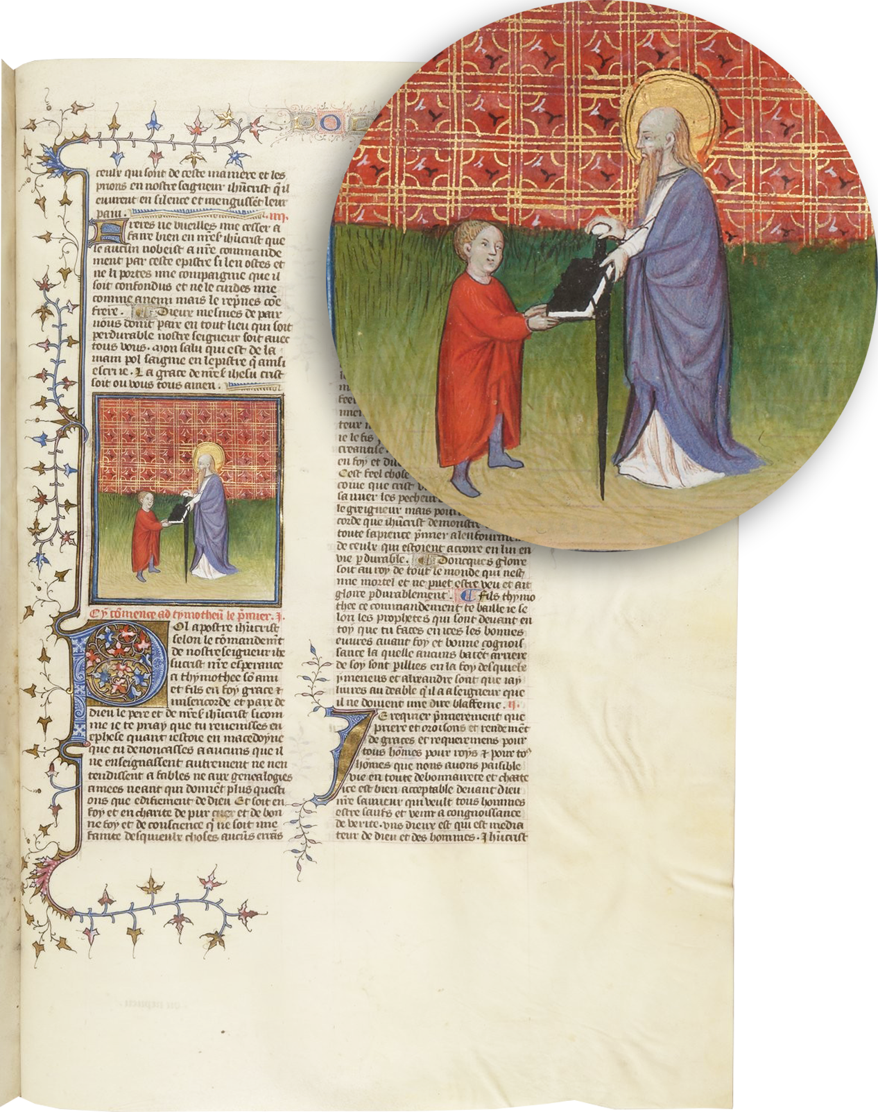 A miniature with Saint Paul opening the Book of Timothy in a Bible historiale, c. 1405 (Paris, Bibliothèque de l’Arsenal, MS 5058, f. 471)