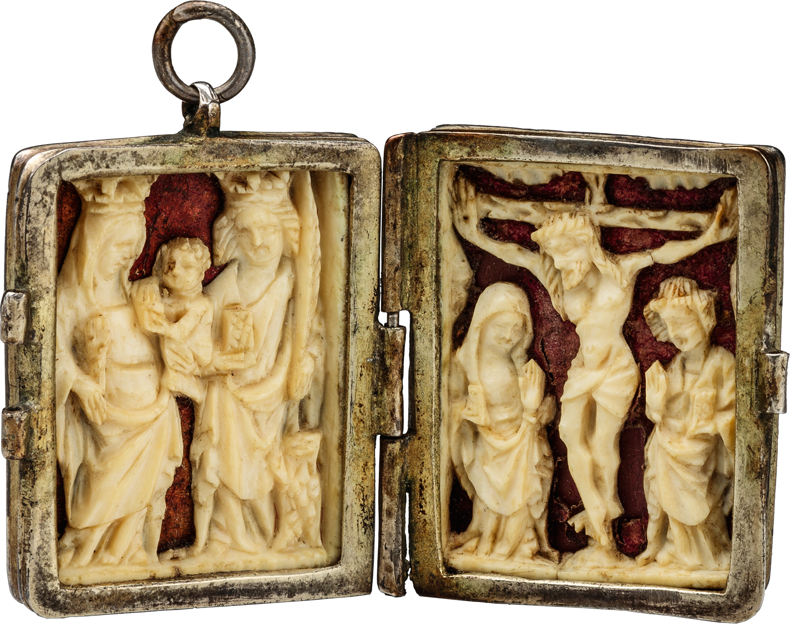 Les Enluminures, Diptych Pendant with Virgin and Child and Crucifixion Scene, Probably Germany (Lower Rhine?), late 14th century