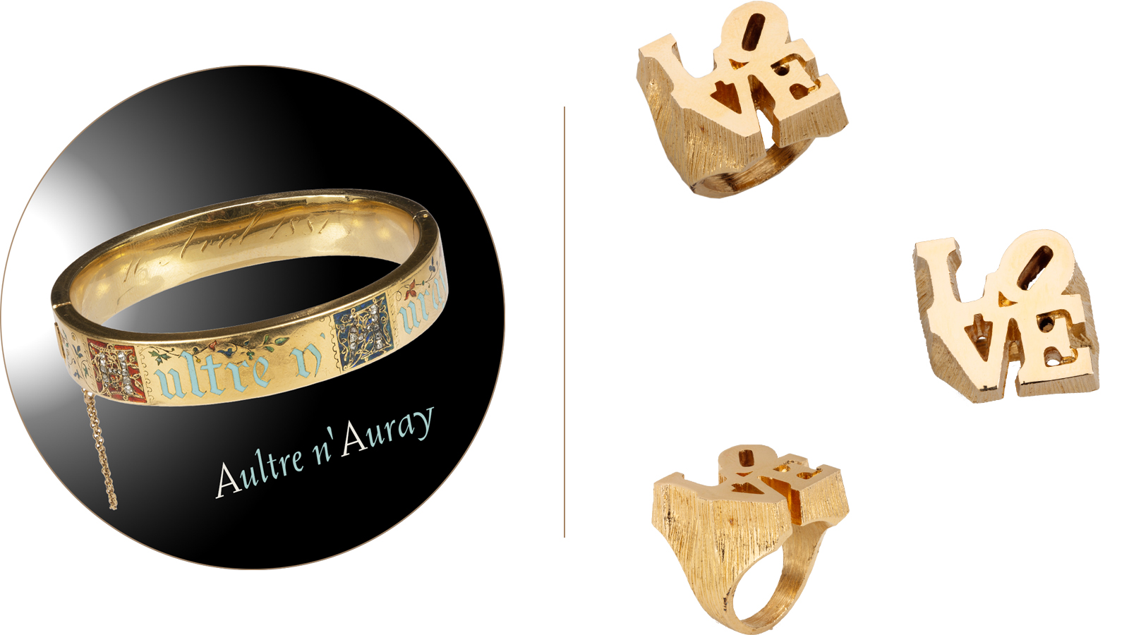 On the left: Lucien Falize, Enameled Hinged Bracelet, France (Paris), c. 1881. On the right: Robert Indiana, "Love" Ring, United States, 1969 (R704)