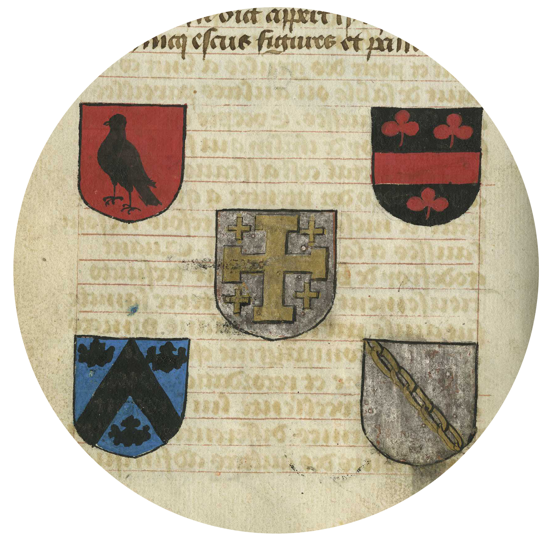 This shield illustrates the tincture gules (red), TM 818, f. 4v (detail)