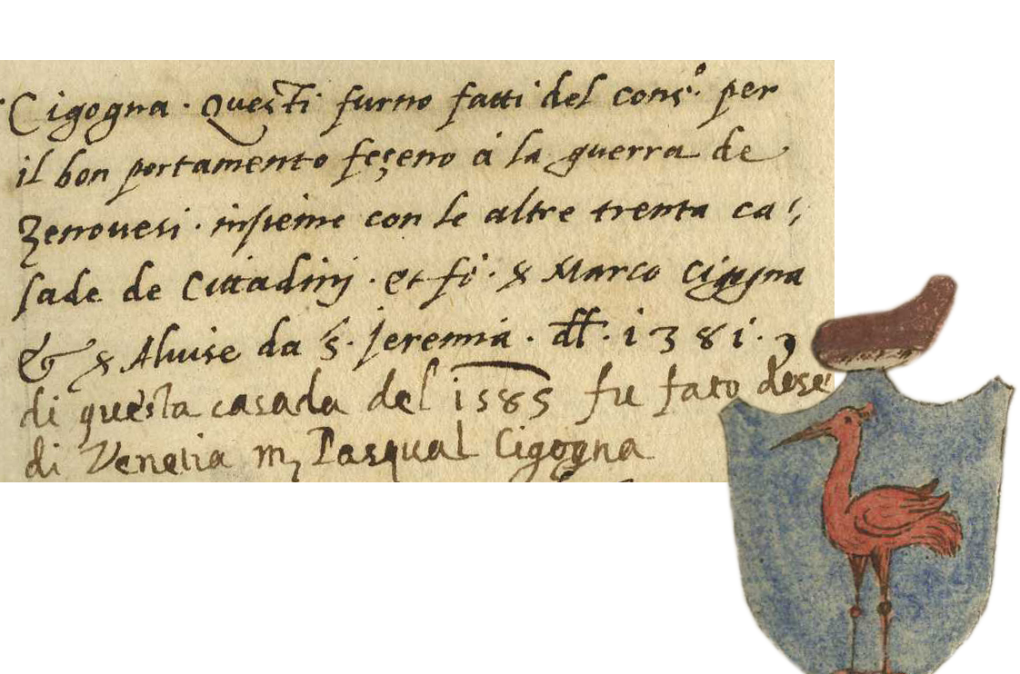 In addition to two added lines updating this entry for the Cicogna family, note the somewhat smudged and clumsy corno ducale that has been added to the family arms, TM 802, f. 10 (detail)