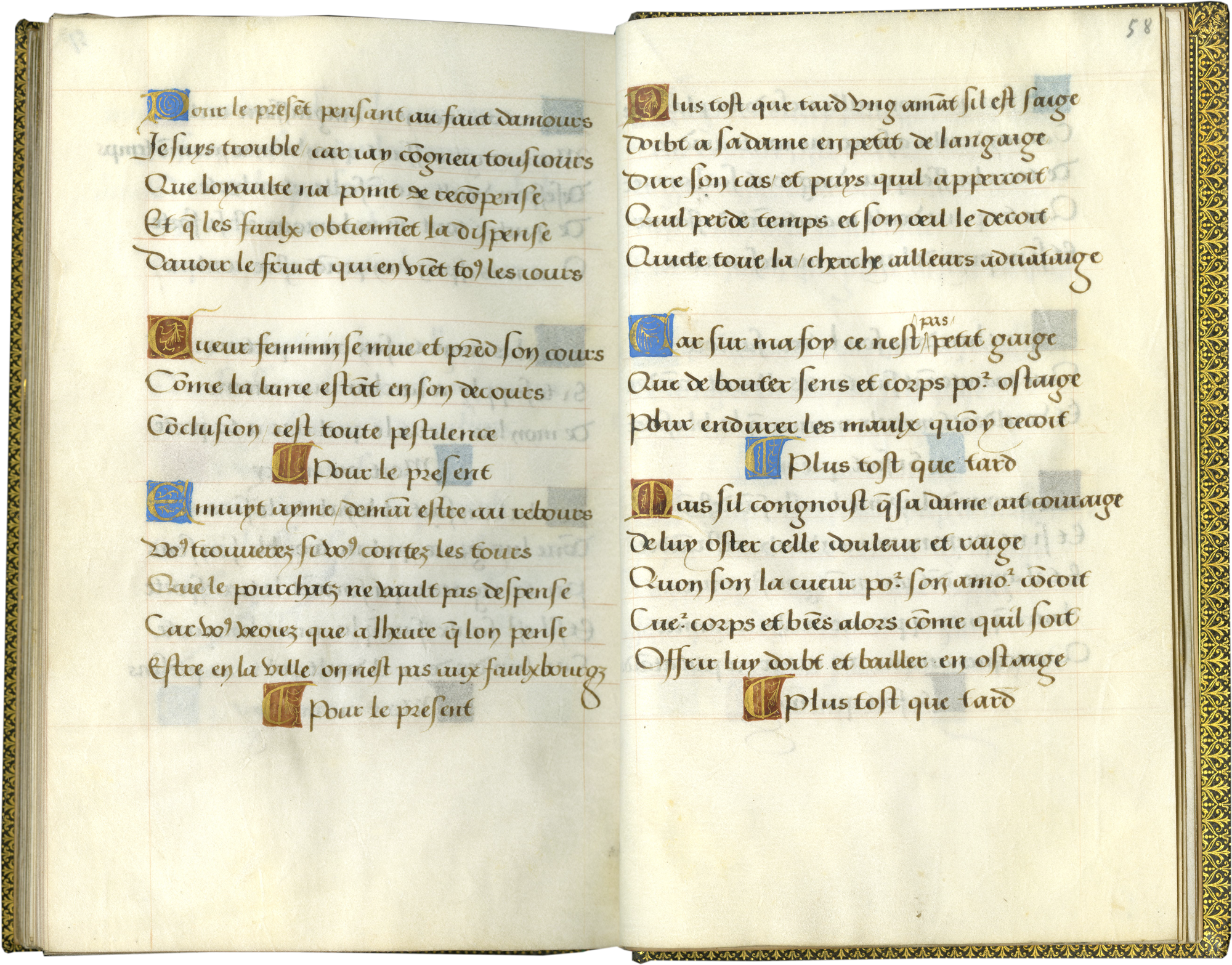 We believe that this sixteenth century volume of courtly love poetry was made with an aristocratic patron in mind. Its handsome script and painted initials suggest it was intended for a member of the French court. Was it given by a poet who was currying an aristocratic patron's favor or was it a thank-you gesture to an already reliable patron?