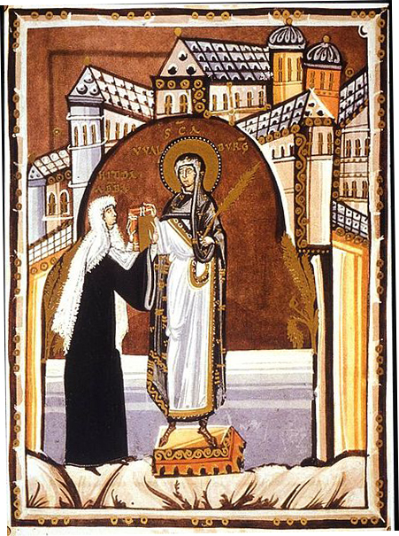 In this miniature, Abbess Hitda presents the Gospel Book she commissioned to Saint Walpurga, Universitäts- und Landesbibliothek Darmstadt, Hs. 1640, c. 1020.