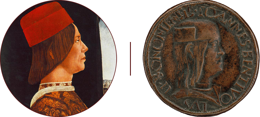 Portrait of Giovanni II Bentivoglio, c. 1480, by Ercole de' Roberti. Bronze medal of Giovanni II Bentivoglio, Francesco Francia (attributed to), National Gallery of Art, Samuel H. Kress Collection, 1957.14.777.a