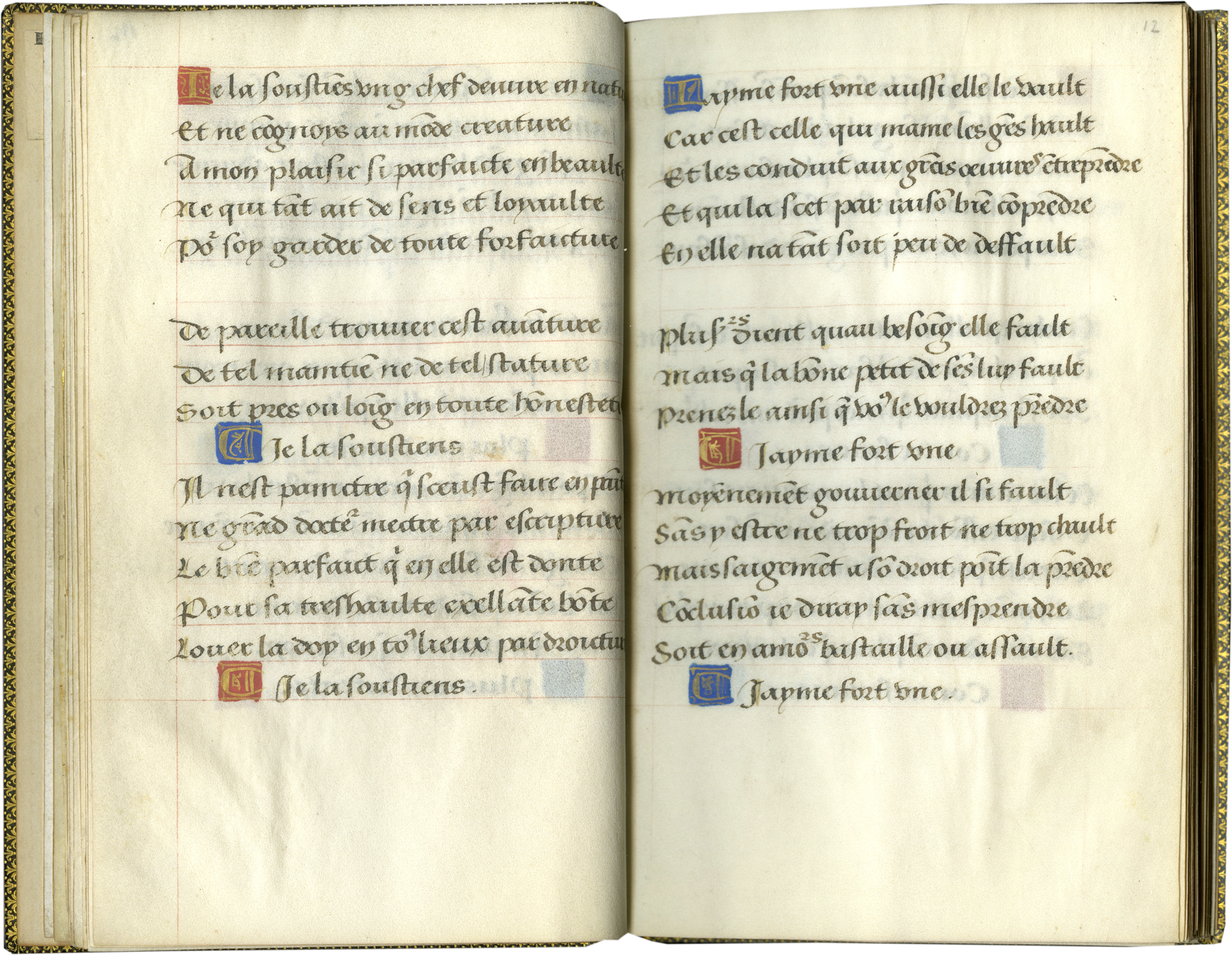 Fine calligraphy and shining illumination grace this beautiful book of French rondeaux, TM 860, France (Paris?), c. 1500-1515(?), ff. 11v-12