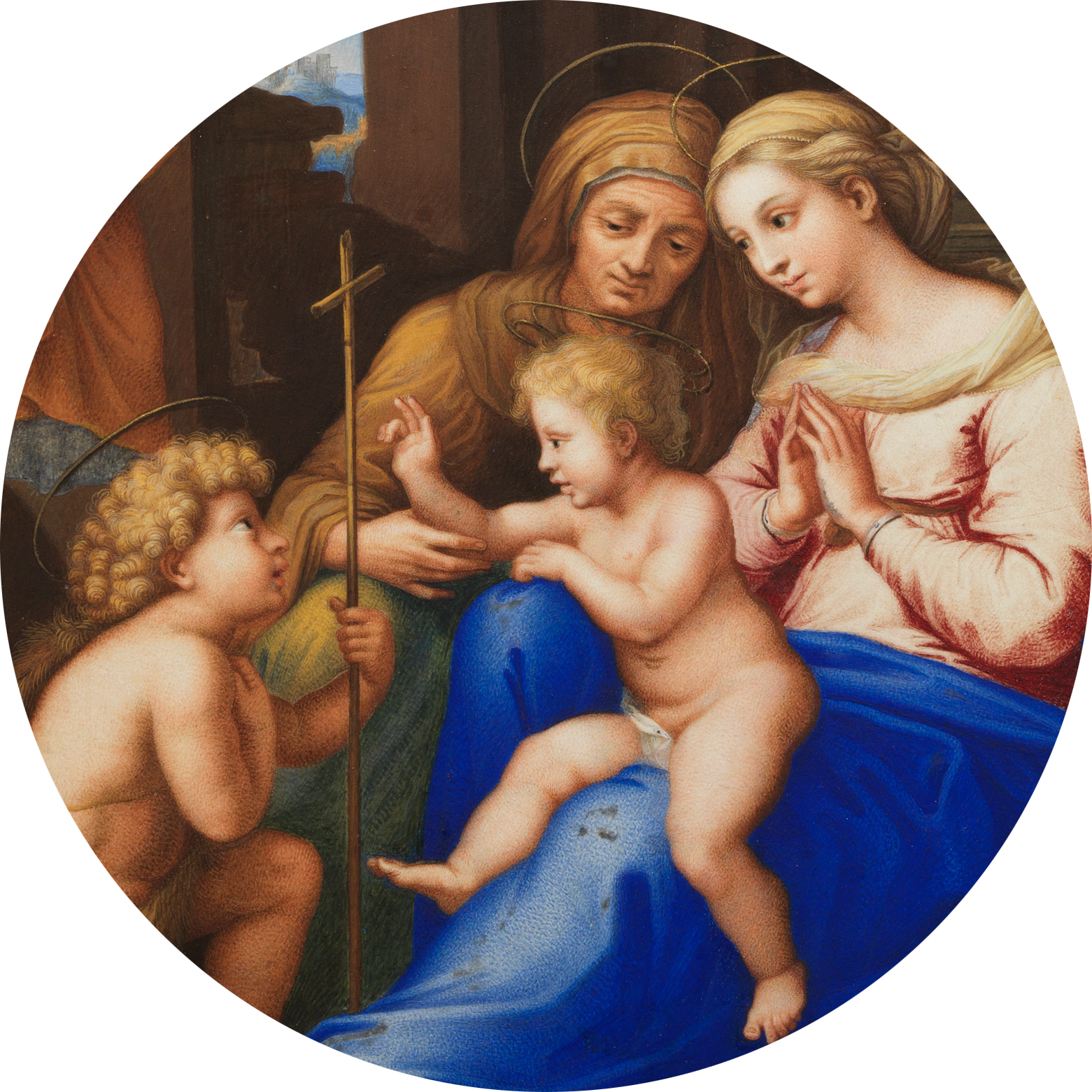 Based on an oil painting by Giovanni Francesco Penni, Giulio Clovio’s superb miniature renders the Holy Family in loving detail, Holy Family or “Madonna del divino amore,” Italy, Rome, c. 1560 (detail)