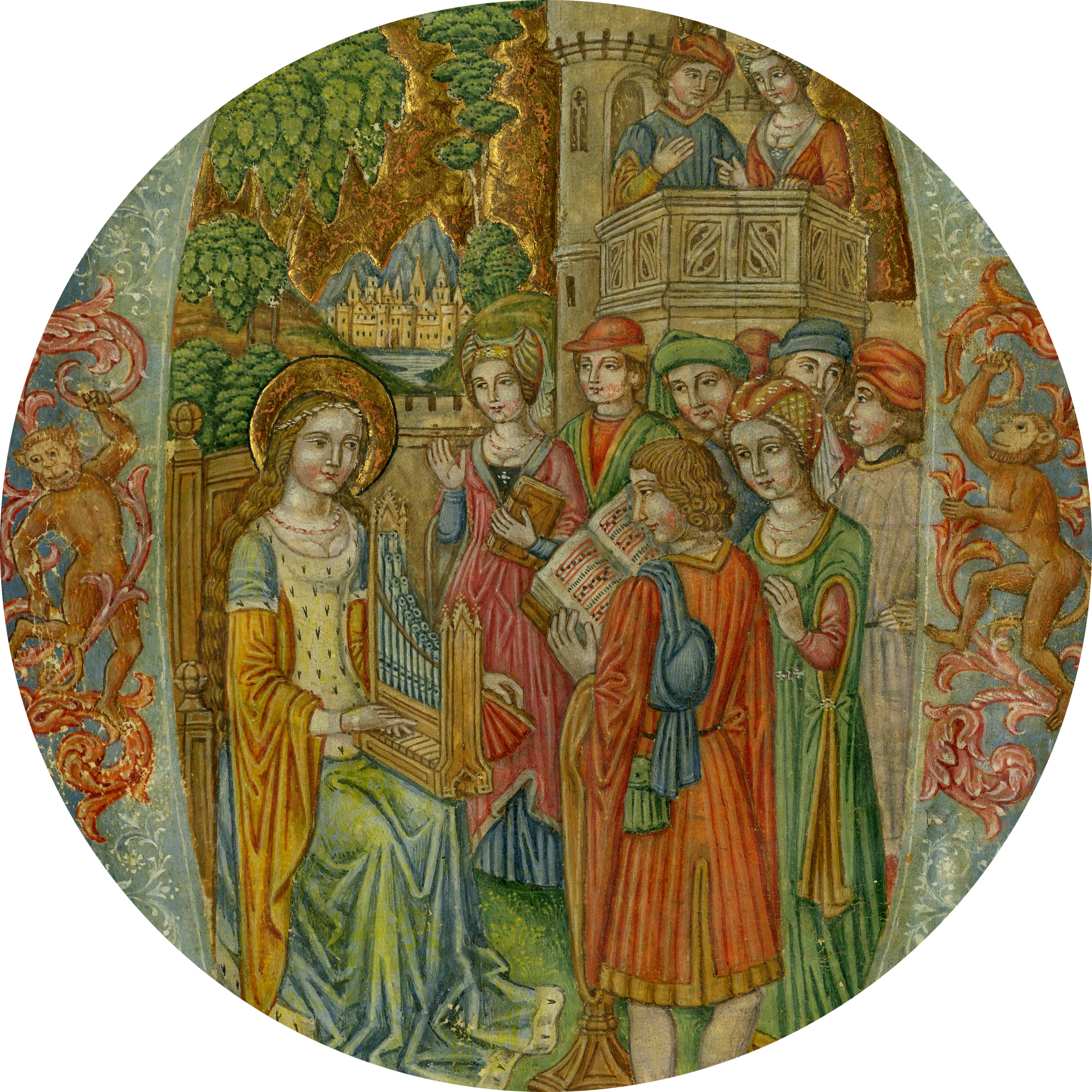 Elegant men and women mingle and listen to music in a verdant garden beside a castle in this twentieth-century miniature, painted by the Spanish Forger, one of the most skillful forgers of all time, St. Cecilia Playing Music in a Courtly Gathering, France, probably Paris, perhaps after 1925 (detail)