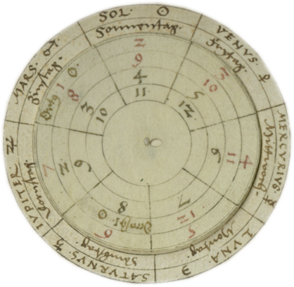 You can see the planets and their signs identified in the outermost field of this working volvelle, a kind of proto-computer, which was added by the book’s early owner and would have allowed him to quickly determine which planet ruled over every hour of every day of the week, TM 850, front pastedown (detail)