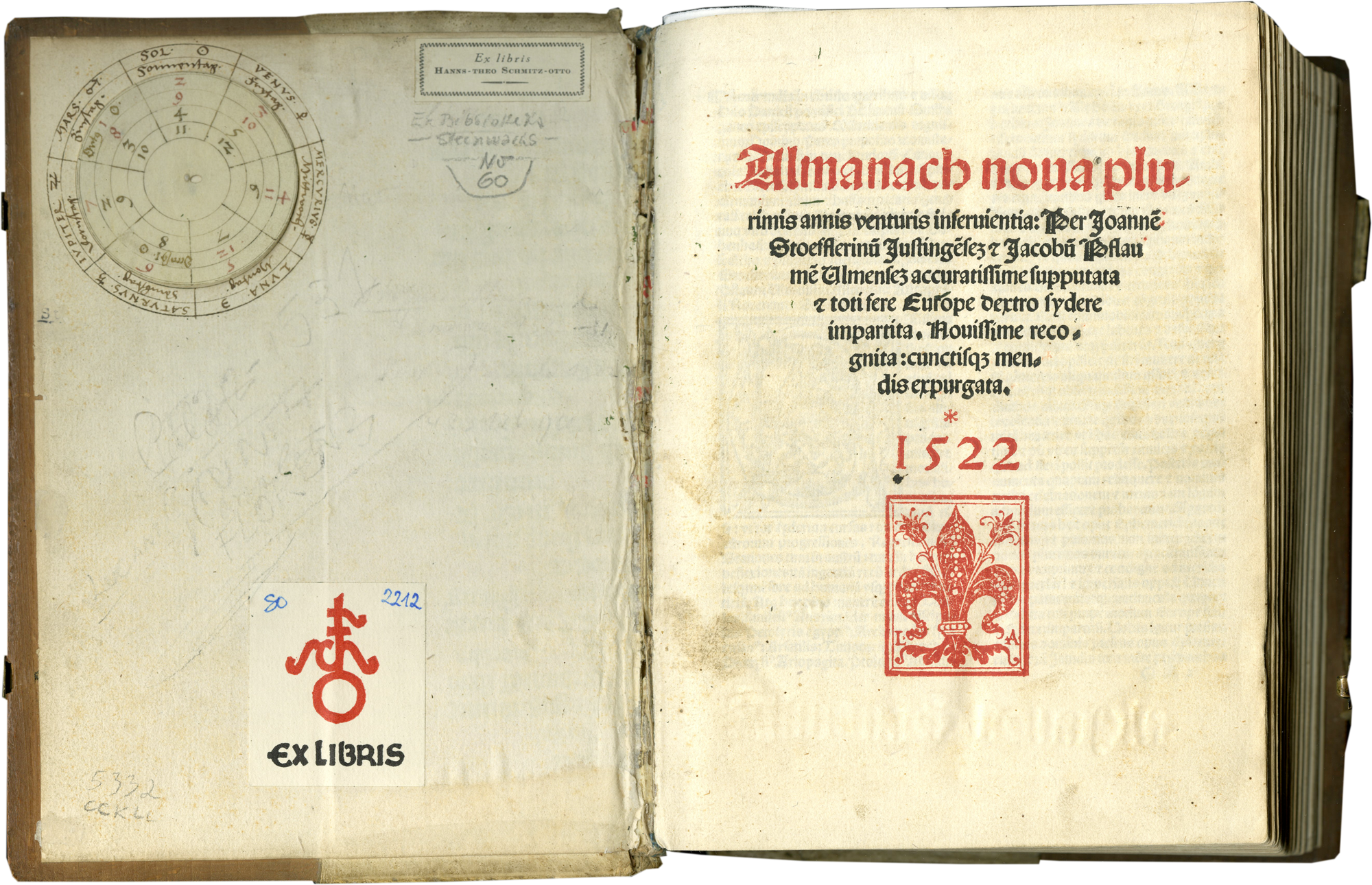 The initial opening of a printed almanac, Johannes Stöffler and Jacob Pflaum’s Almanach nova plurimis annis venturis inservientia, with its title page, TM 850, printed in Venice by Lucantonio Giunta, 1522, front pastedown and sig. A1 recto