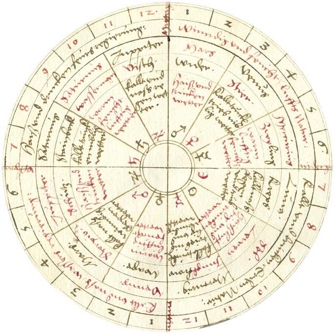 In fact, we know the book was used this way. This volume’s earliest owner customized it with many additions. Chief among them are extensive notes in German that explain how to forecast the weather using the almanac’s tables. The book’s owner even drew a complex weather diagram, shown below, enabling him and later users to draw correspondences between planetary influence and weather conditions.