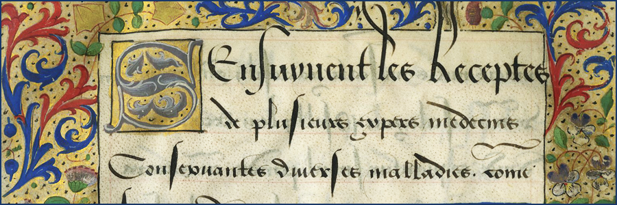 A book always makes an excellent present, and an elegantly written and decorated illuminated manuscript makes an even better one (we talked a little about this in our earlier blog, “Gifts of the Past”). But what makes this an especially good gift are the texts it includes: medical recipes, a health regimen, and a pharmacopoeia of plant-based remedies. (In the modern world we usually think of recipes as instructions for preparing food, in the Middle Ages and well into the early modern era a “recipe” was understood as a how-to instruction of any sort, including, as in this case, medical remedies.) The recipes mention many ailments: constipation, kidney stones, stomach pain, colic, plague, pleurisy, tertian and quartan fevers, and heart failure (to name only a few).