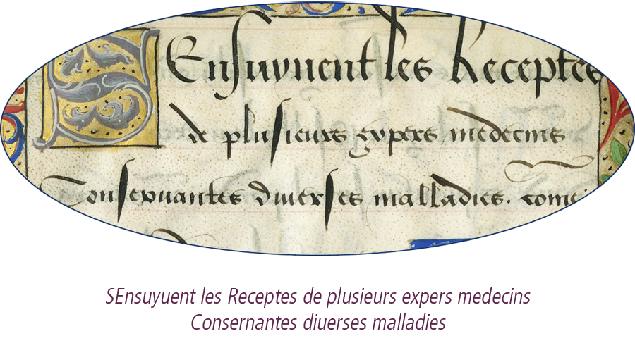The entire text is in French (a notable point for a time when many academic medical texts were still circulated primarily in Latin), and most of the recipes are from contemporary physicians, rather than traditional sources from the past, including, among many others, François d’Allez and André Briau, doctors for the king of France. Many are ascribed to “Master Bernard,” who was almost certainly the Archbishop’s own doctor.