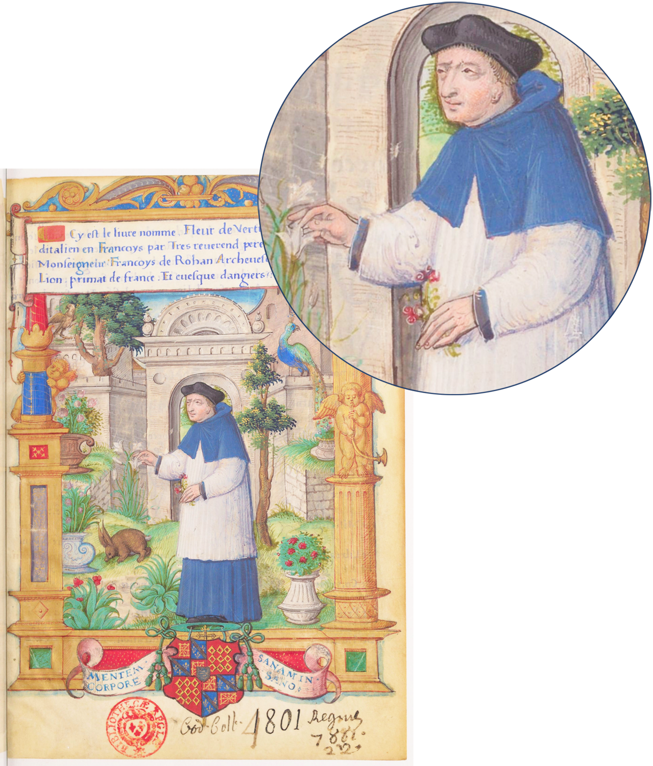 Not surprisingly, given his family, François II de Rohan was an important figure in his own right. He was appointed bishop of Angers at the age of nineteen (in 1499) and was elevated soon after to the archbishopric of Lyon (in 1501). He was also a writer. His translation of Fiore di virtu (Flower of Virtue), an early fourteenth-century Italian collection of moral texts, has survived in a luxuriously illuminated manuscript (Paris, BnF, MS fr. 1877, produced c. 1530), illustrated in Paris by an artist known as the Master of François de Rohan and probably made for presentation to Marguerite de Navarre.