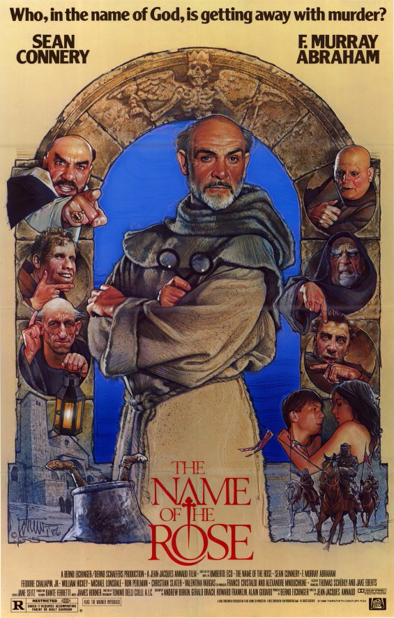 Bernard Gui is a villain in Umberto Eco’s Name of the Rose, as dramatically conveyed by F. Murray Abraham in the upper left corner of this theatrical poster for the film adaptation, Drew Struzan, 1986